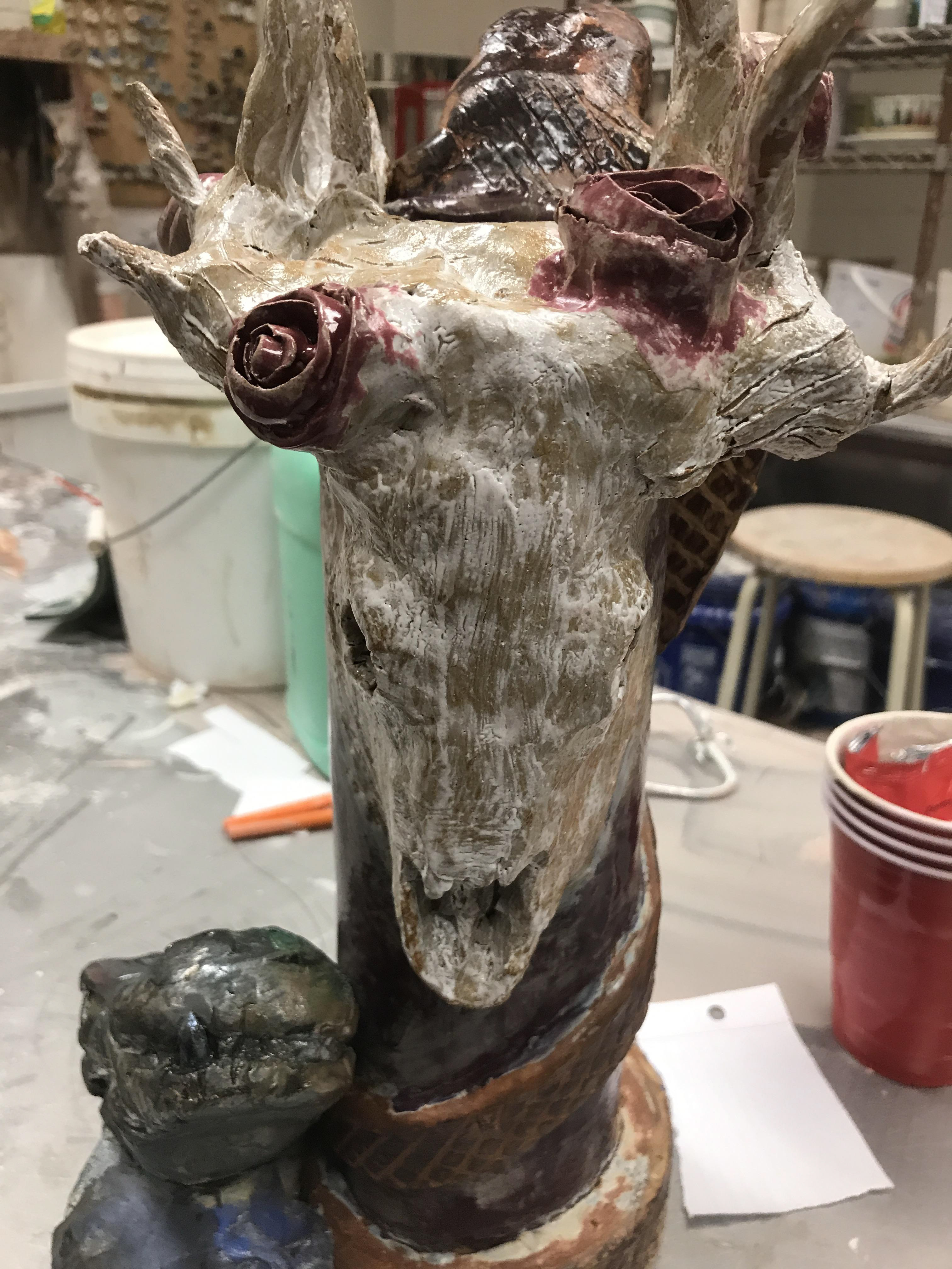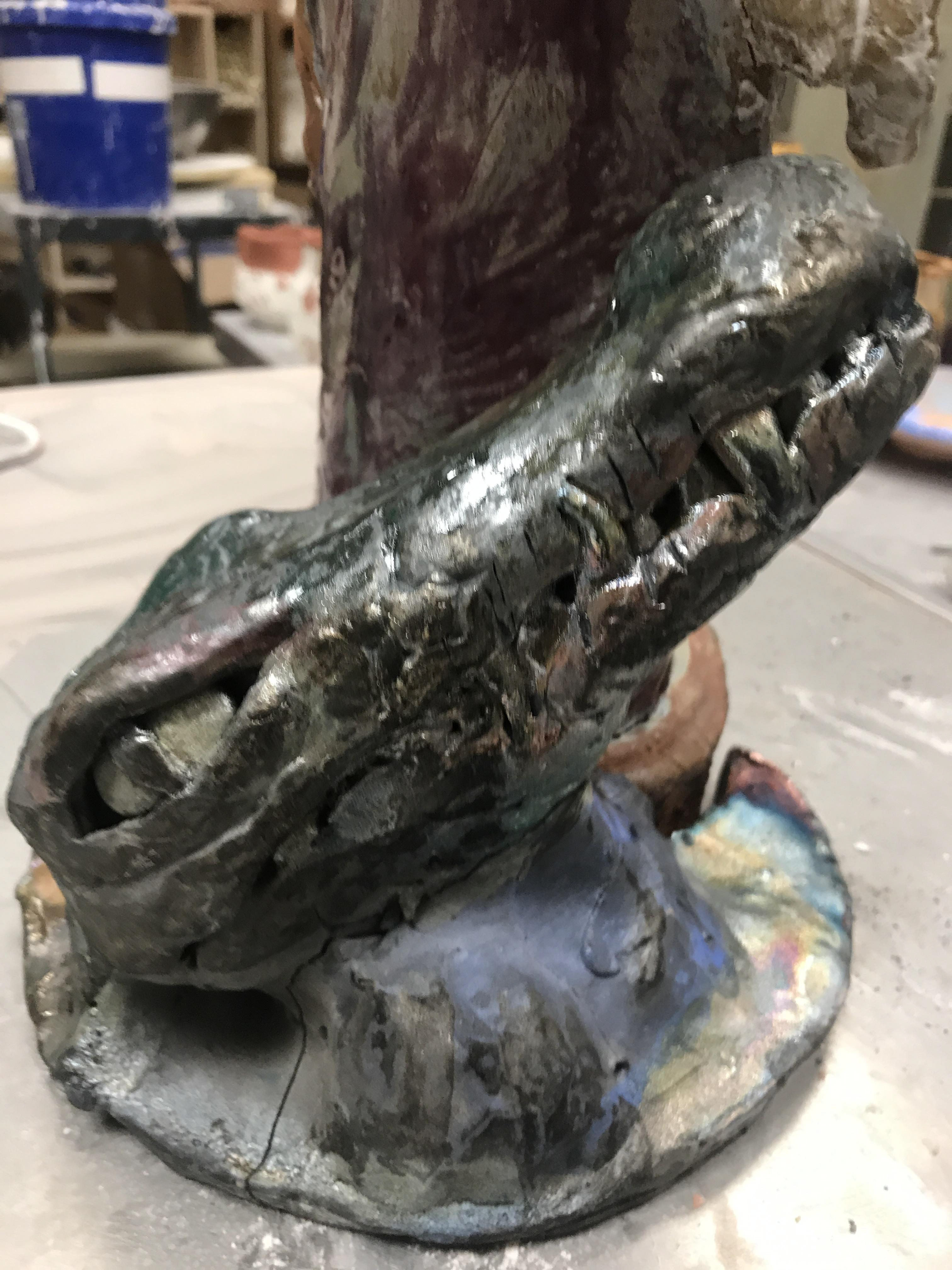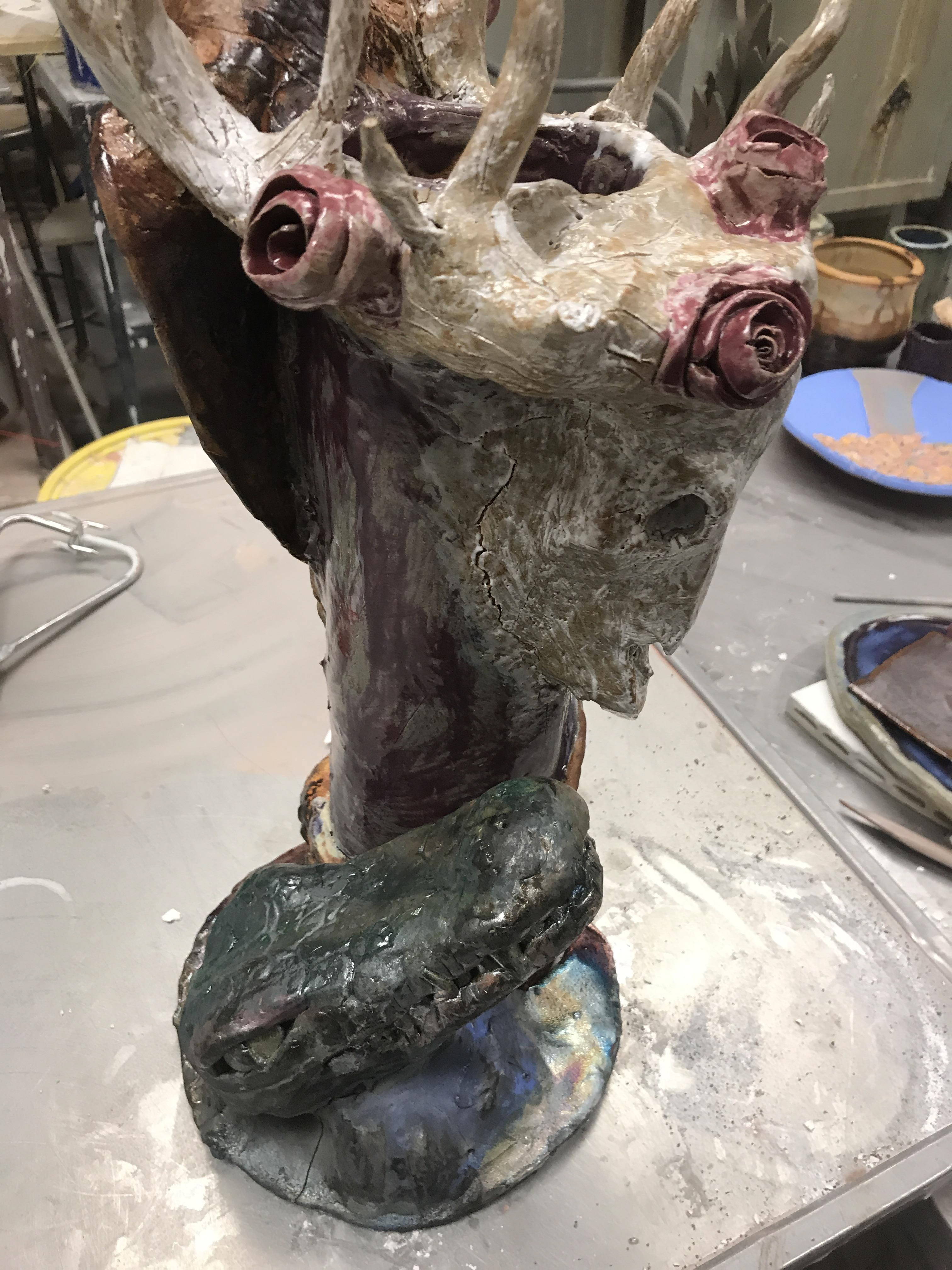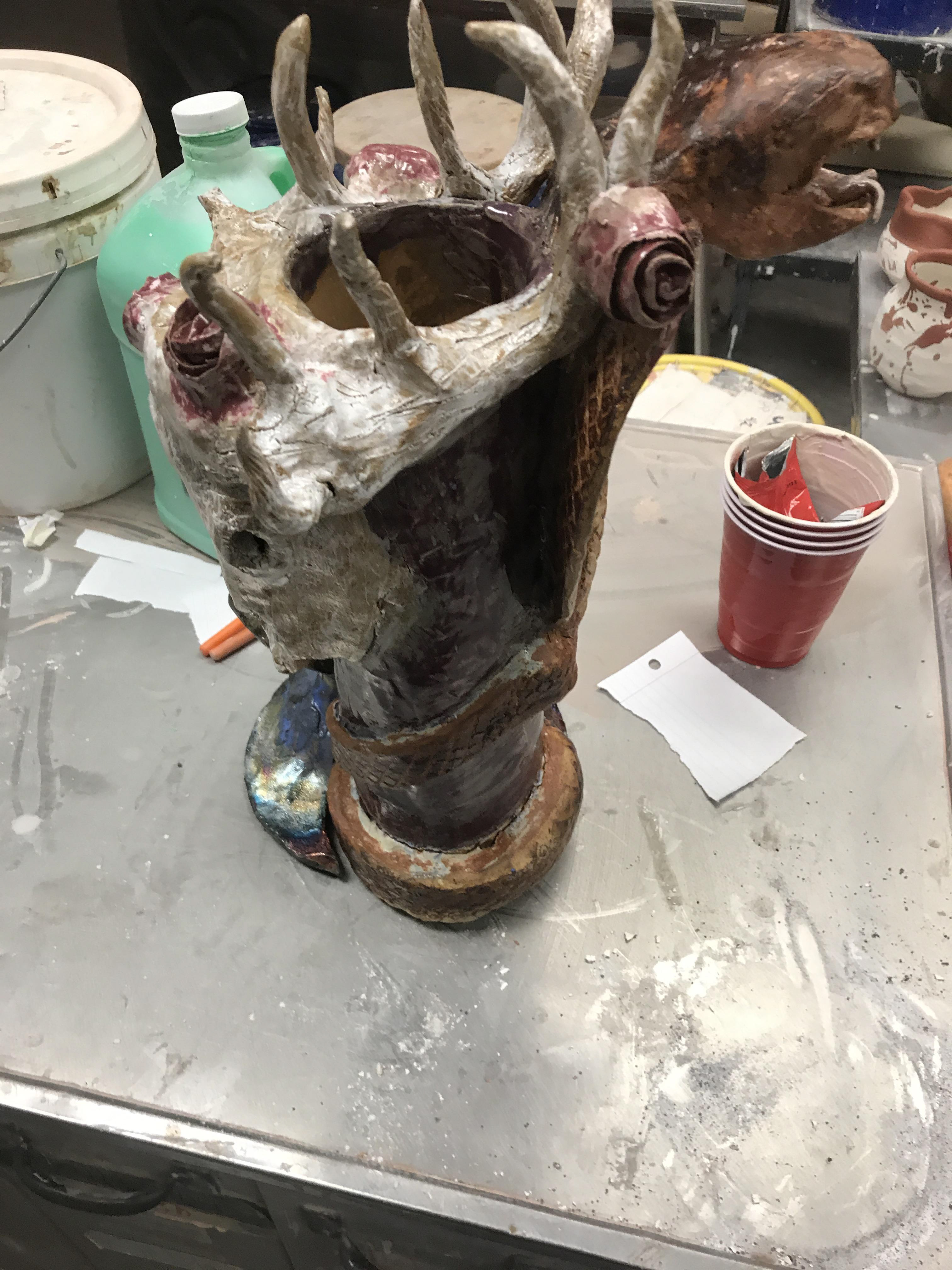 "Animal Totem" a ceramic totem made with different animals where different firing styles were used.